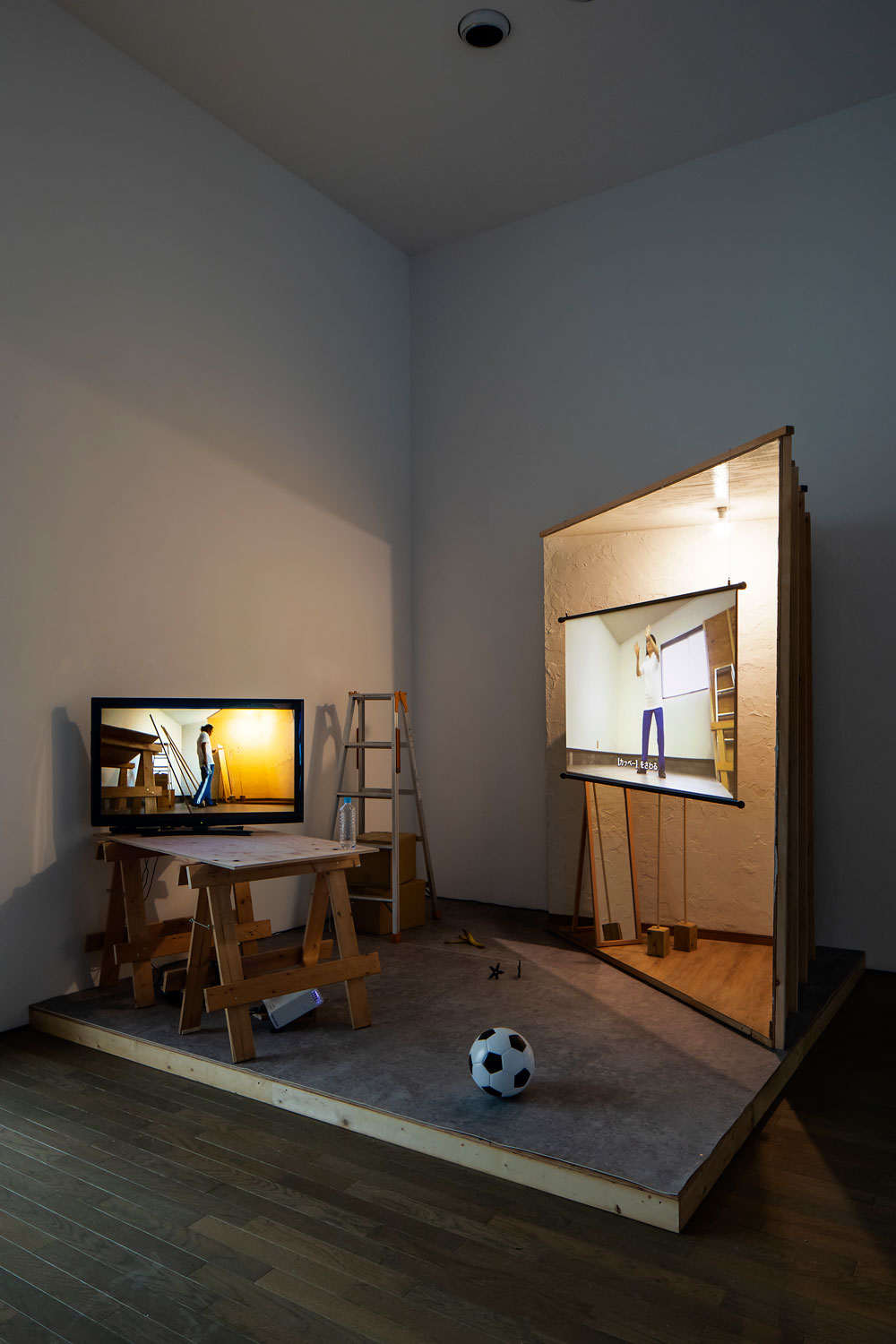 2019 video, soccer ball, shuriken, banana sculpture, mirror