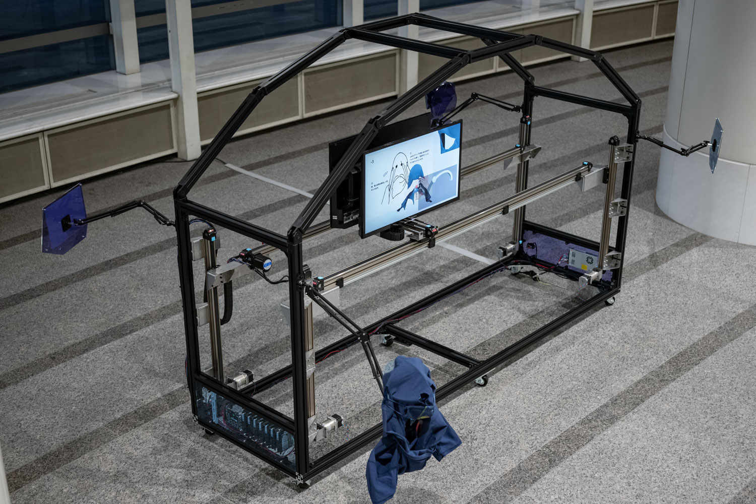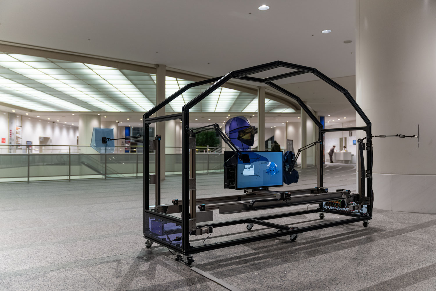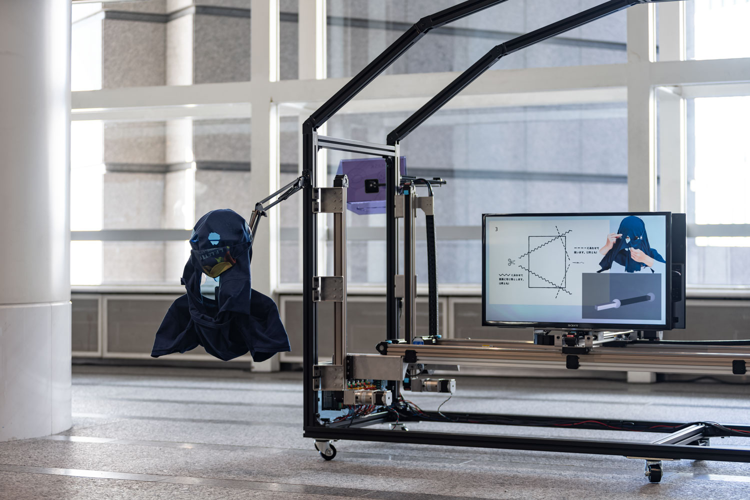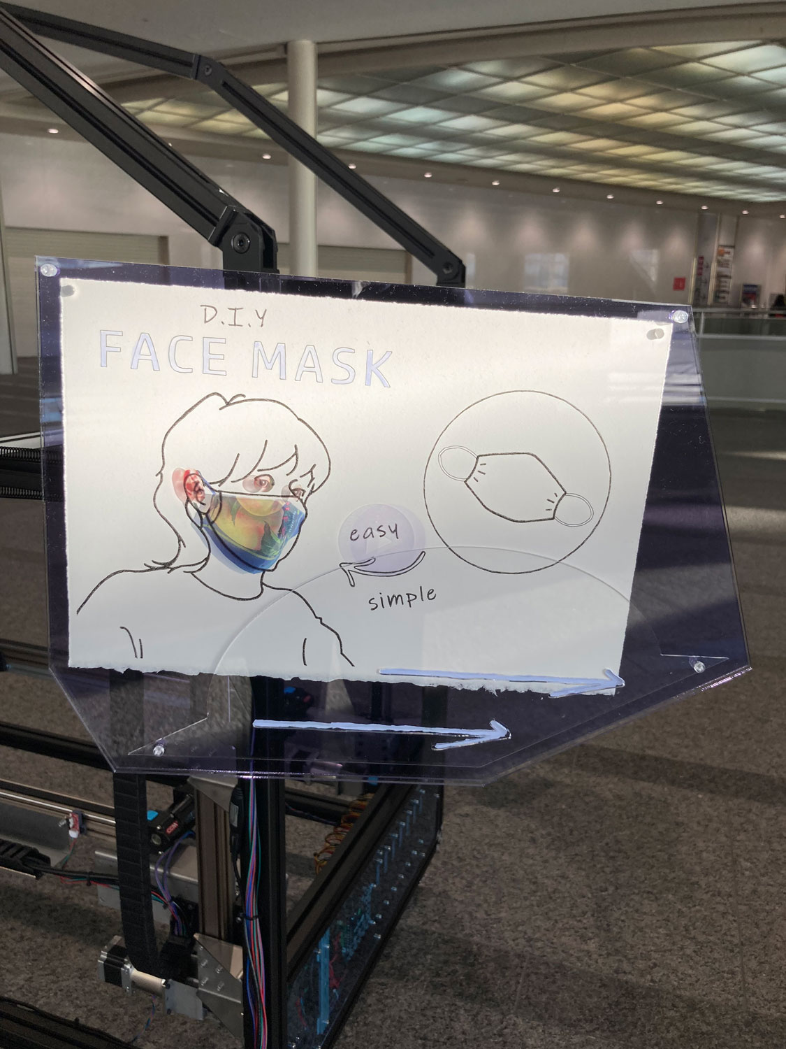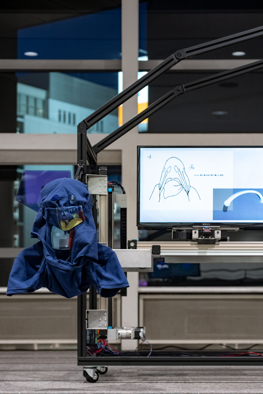 2022 video, mask, t-shirt, uv-print, acrylic, aluminium flame, motor