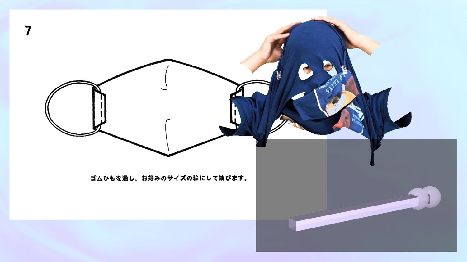 マスクをつけたときに口を覆う予定のマスクの部分(布)をあらかじめ口の前に配置した状態でマスクの完成を目指す。
