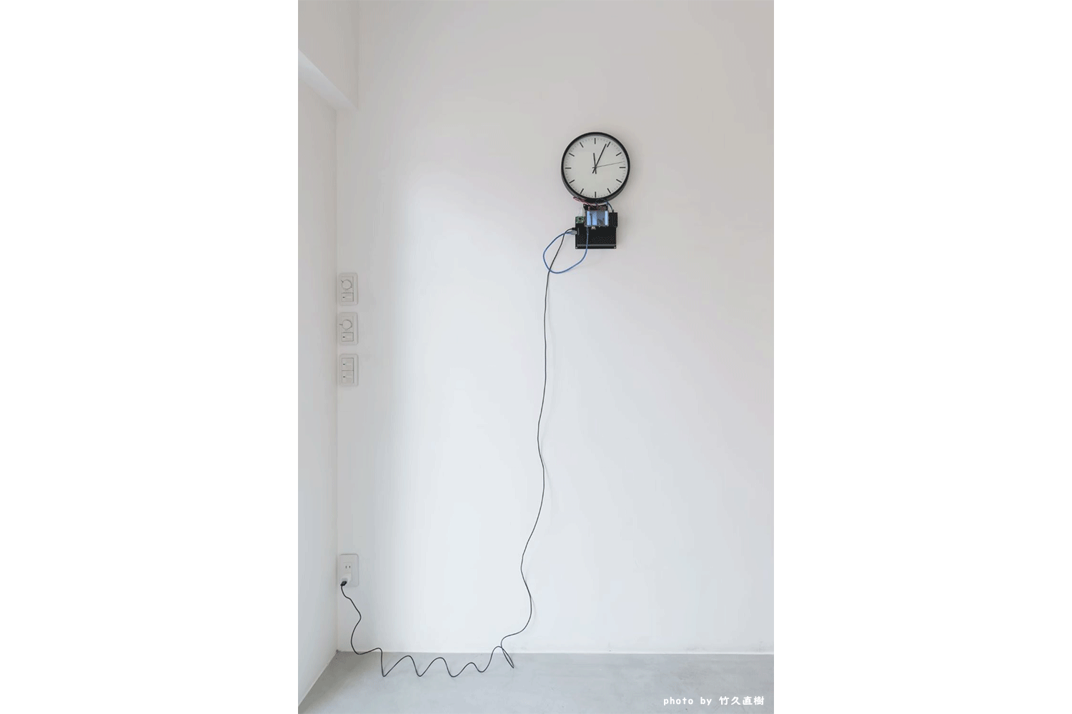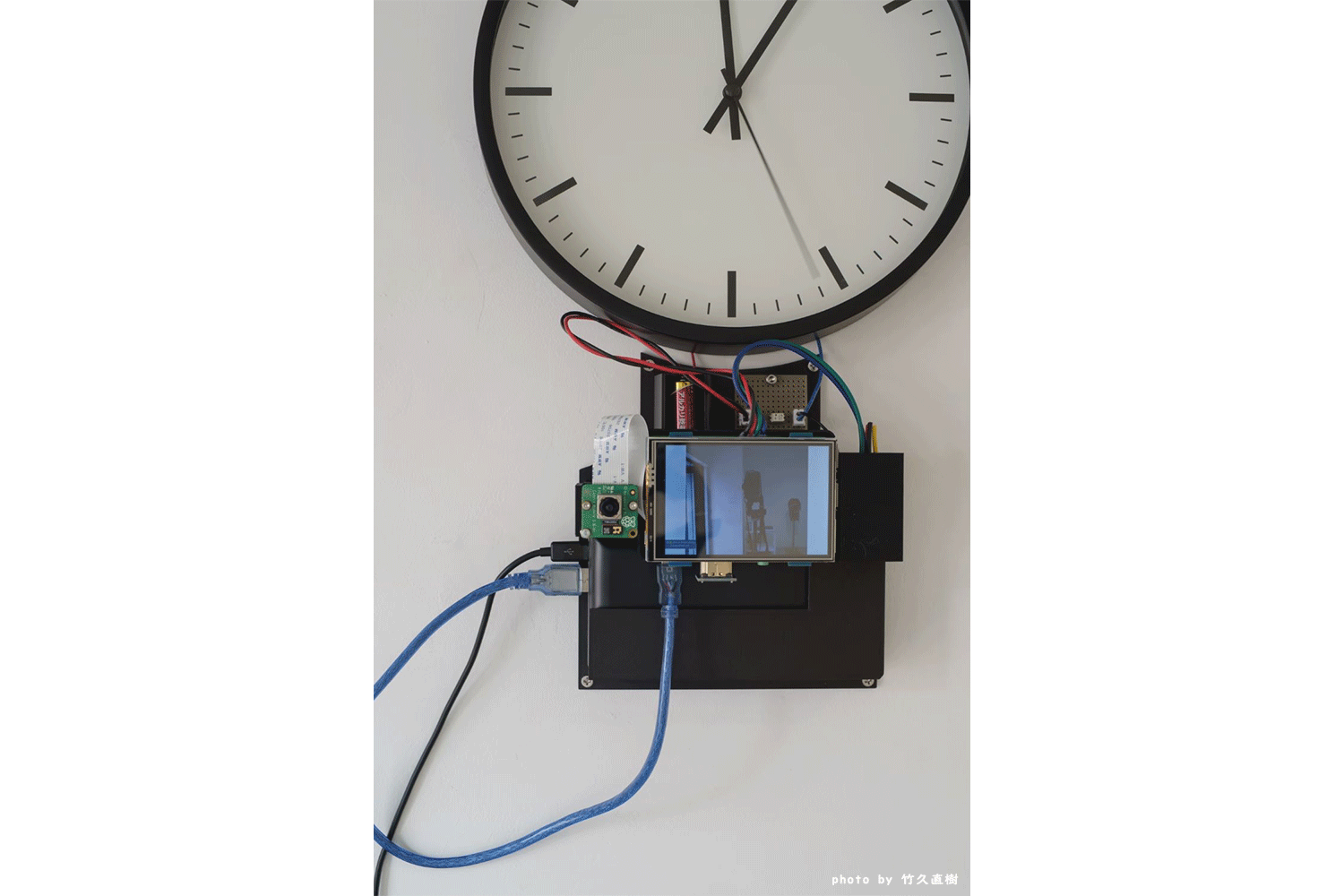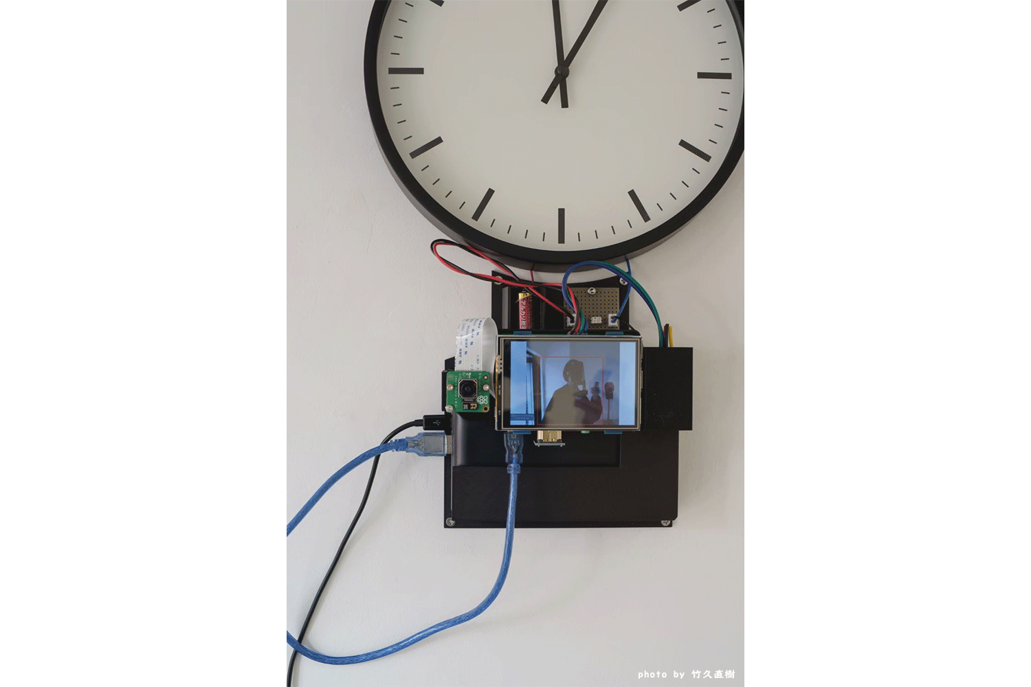 カメラに人が映るときに止まって、人が映っていないときに動く時計。移動時など電源がない状況ではバッテリーで動作する。