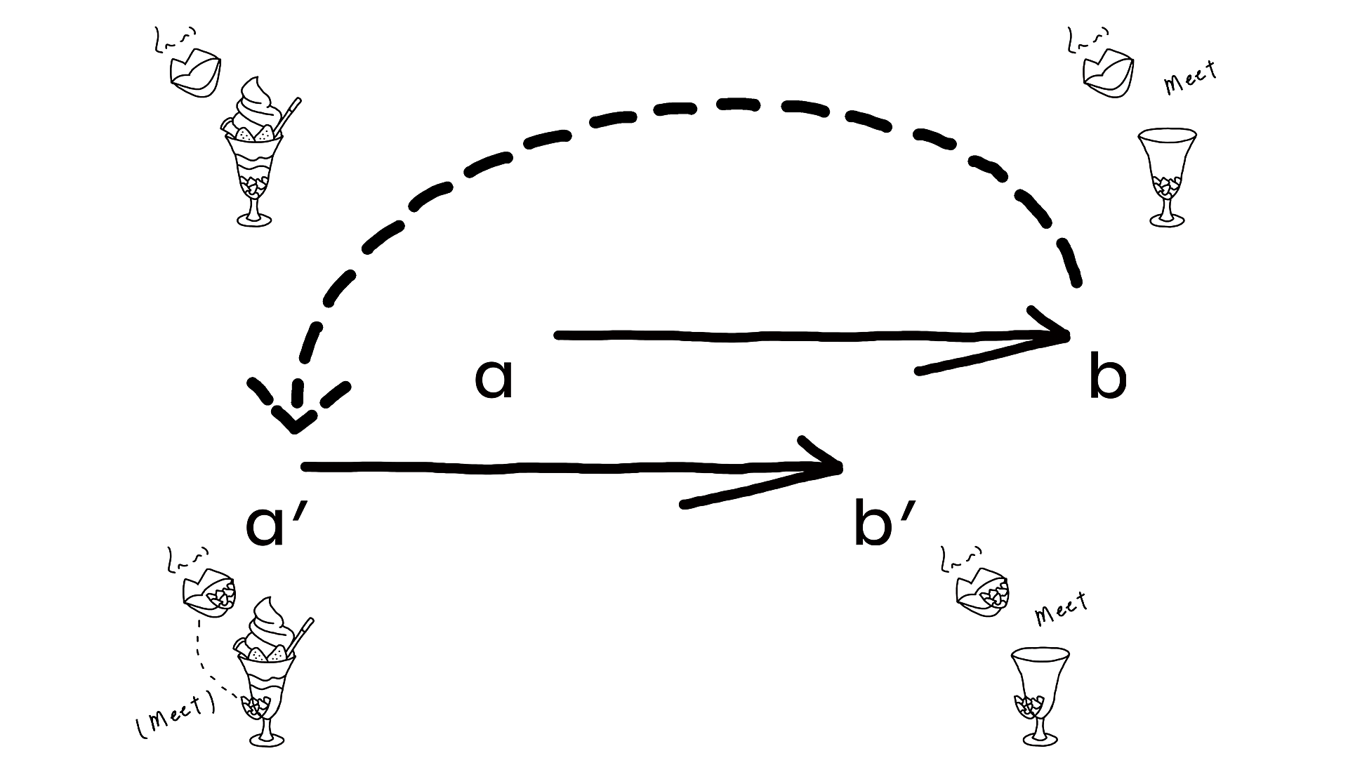 例えばパフェについて。パフェを食べる際、そこには最上層の生クリーム(a)から始まり最下層のコーンフレーク(b)に向かう過程がある。口とコーンフレークが初めて出会うのは終盤であろう。その出会いを早める。口の中にコーンフレークがある(出会っている)状態で最下層(b’)に向かう、行為。